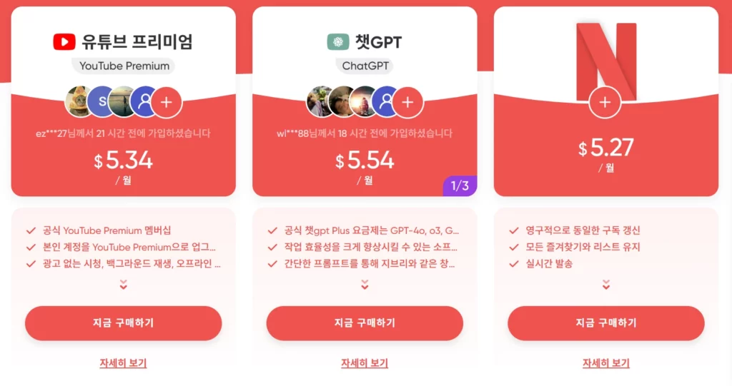 공식 구독료와 비교하면 약 70% 이상 저렴하게 이용할 수 있습니다. 예를 들어, 넷플릭스의 가장 좋은 화질인 UHD 요금을 기준으로 볼 때, 4명이 함께 사용하면 개인이 내야 하는 비용의 1/3도 안 되는 금액으로 구독할 수 있습니다. 한 달에 커피 한두 잔 값으로 다양한 OTT 콘텐츠를 즐길 수 있다는 건 정말 매력적인데요.