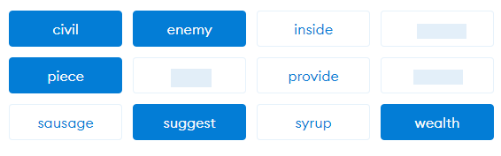이제 아까 적어 놓은 단어를 순서대로 클릭해줍니다. 선택한 영단어는 파란색 배경으로 바뀝니다. 이후 다음을 누르면 축하 메시지가 나옵니다. 한 번 읽어보시고 ‘모두 완료’를 눌러주세요.